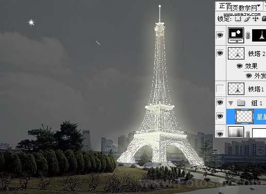 11、創建星星。點擊圖層面版下方的“創建新組”按紐,命名為“星星”。選取該組的前提下,點擊“創建新圖層”按鈕,命名為“星星1”圖層。按f5按紐,調出畫筆面版,選取柔角8相素左右的筆尖,圓度設為“0”,角度設為“0”,前景色設置為白色。選取“星星1”圖層,在“圖層”夜空位置點擊,畫出“一橫”的白光;然后,依次將畫筆的角度設置為“45、90、135”,并在原有的“一橫”的基礎上疊加出“米”字形的“星星”圖像。