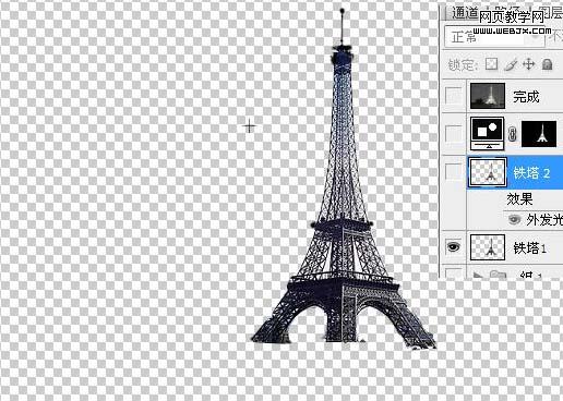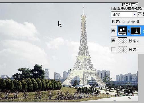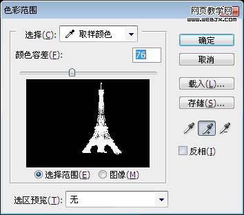 4、(利用“磁性套索”對鐵塔完成的選區包含了天空部分,要用其它選區工具剔除) 選擇“鐵塔1”圖層,按下ctrl的同時,點擊“鐵塔1”縮略圖,把“鐵塔1”圖層轉化為選區。“打開“選擇——色彩范圍”,利用“吸管工具”點擊圖像中的鐵塔,調節“顏色容差”讓鐵塔在圖像中逐漸亮起來,不明顯的地方用“添加到取樣”工具加強,這樣就得到了鐵塔的精確選區。點擊圖層面版下方的“創建新圖層”按鈕,創建新圖層,并命名為“鐵塔2”。