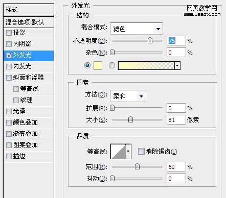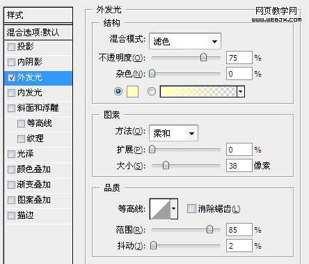 8、選取“鐵塔2”圖層,在縮略圖外的空白部分雙擊,調出“圖層樣式”,并選取“外發光”,打開“外發光”設置面版。調節“圖素——大小”和“品質——范圍”,其它設置不變,具體如下圖: