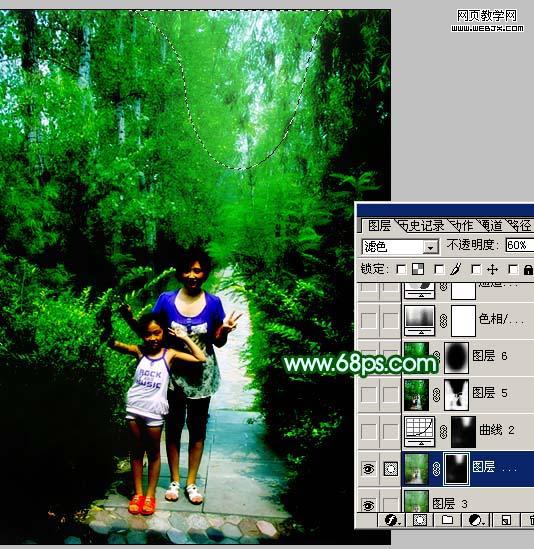 3、把當前操作圖層復制一層,圖層混合模式改為“濾色”,圖層不透明度改為:60%,加上圖層蒙版,只保留下圖選區部分,其它部分用黑色畫筆擦掉。