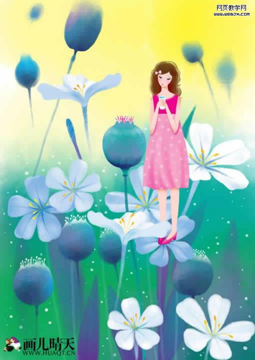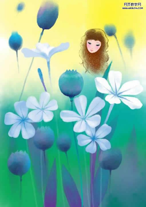 下還是想在繼續加一個元素增加畫面的層次和空間,于是又加了一束花放在人物前邊,這樣畫面多了一個前后關系,其他花苞加的是白須,不搶鏡頭,這樣視覺集中在女孩身上,到這里這幅插畫就算完工了。