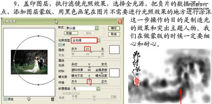 9、新建一個圖層,蓋印圖層,執行:濾鏡 > 渲染 > 光照效果,選擇全光源,參數設置如下圖,確定后用黑色畫筆在圖片不需要進行光照效果的地方進行涂抹,這一步操作的目的是制造光的效果和突出人物。