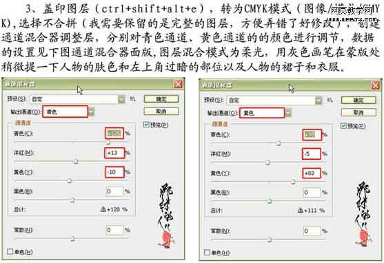 3、新建一個圖層,按ctrl + alt + shift + e 蓋印圖層,選擇菜單:圖像 > 模式 > cmyk 顏色,選擇不合拼。然后創建通道混合器調整圖層,分別對青色及黃色進行調整,參數設置如下圖,確定后把圖層混合模式改為“柔光”,用灰色畫筆在蒙版上稍微提一下人物的膚色和左上角過暗的部位以及人物的裙子和衣服。