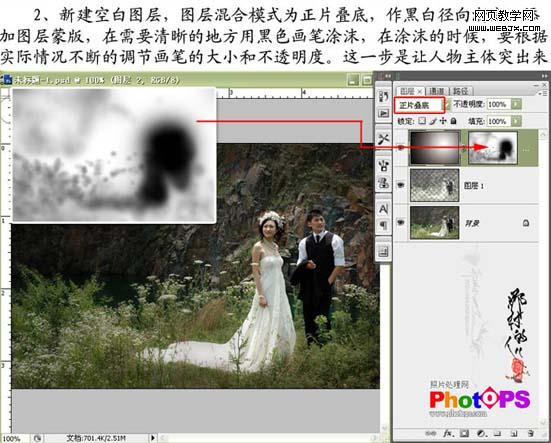 2、新建一個圖層,圖層混合模式改為“正片疊底”,選擇漸變工具做黑白徑向漸變,添加圖層蒙版,在需要清晰的地方用黑色畫筆涂抹,在涂抹的時候,要根據實際情況不斷的調節畫筆的大小和不透明度,這一步是讓人物主體突出來。