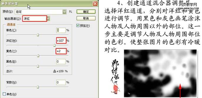 4、創通道混合器調整圖層,選擇洋紅通道,分別對洋紅和黃色進行調節。用黑色和灰色畫筆涂抹人物及人物周圍以外的部位。這一步主要是調節人物及人物周圍部位的色彩,是整個圖片的色彩有冷暖對比。