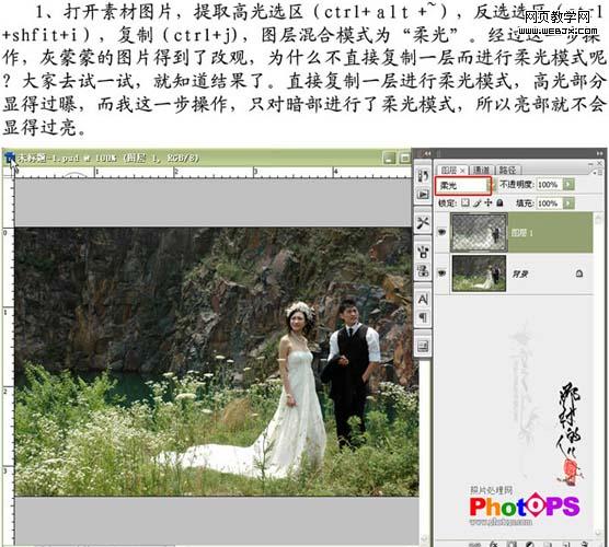 1、打開原圖素材,按ctrl + alt + ~ 提取高光選區,按ctrl + shift + i 反選,按ctrl + j 復制,然后把圖層混合模式改為“柔光”,經過這一步操作,灰蒙蒙的圖片得到了改變。