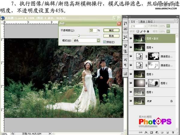 7、執行:圖像 > 編輯 > 漸隱高斯模糊操作,模式選擇濾色,然后降低不透明度,不透明度設置為45%。