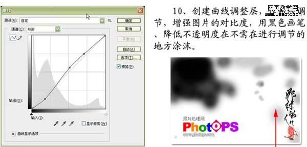 10、創建曲線調整圖層,參數設置如下圖,增強圖片的對比度,用黑色畫筆降低不透明度在不需要調節的部分涂抹。
