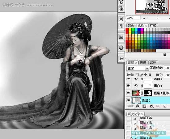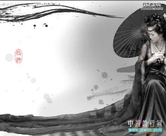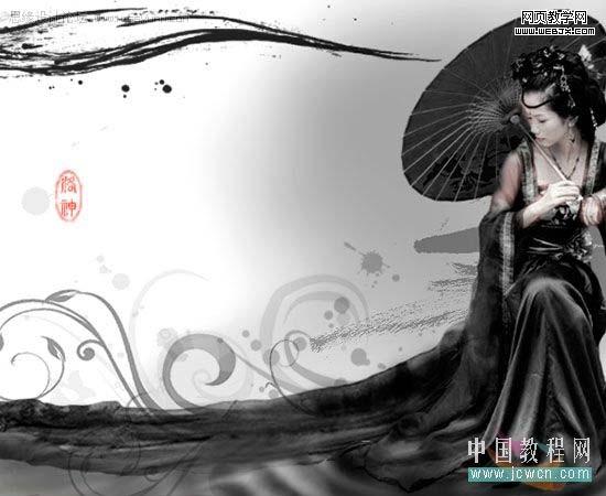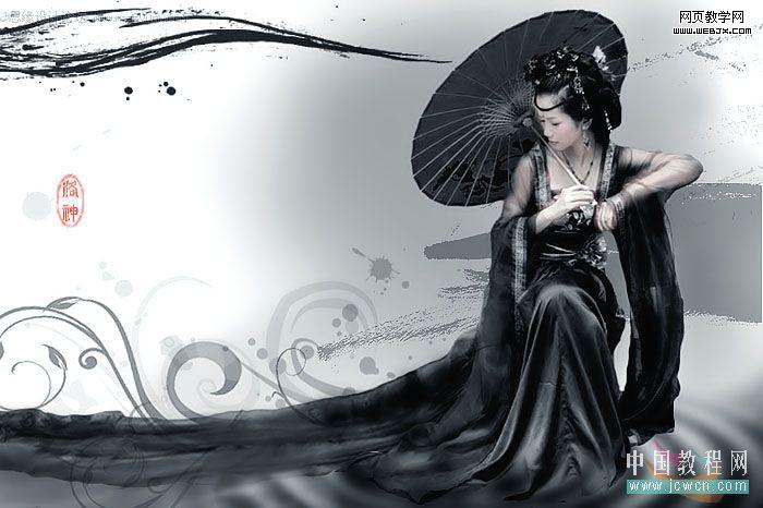 從效果圖即可看出作者的ps功力深厚,人物處理的非常經典,黑白水墨畫一般的意境,襯托出人物的純美。淡淡的水墨筆畫裝飾更能突出畫面的藝術美。