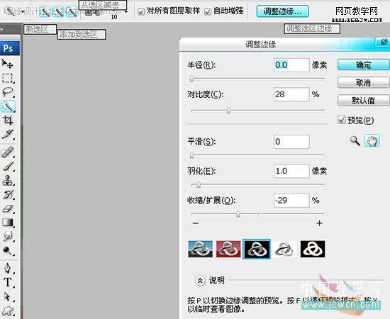 (第一選項是新建一個選區,第二個選項是添加選區,相當于同時按住shift,第三個是從選區減去,相當于同時按住alt鍵,選擇好選區后,點擊后面的"調整邊緣",可以對選區進一步調整)
