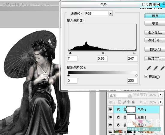 8、加個"色階"調整層,設置一下使黑白明顯[7, 0.96, 247]。