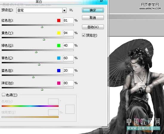 在上面再加一層不同參數的黑白調整層,這次為了使臉部白些,所以把紅、黃色部分的數值調高點 [ 紅色: 81, 黃色:94 ]。此圖層的不透明度可以略調低點,使皮膚保留一點紅色。