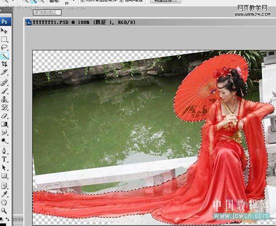 4、把人物選取出來。因為人物總體是紅色,和背景區別明顯,所以我們用"快速選擇工具",可以快捷些。