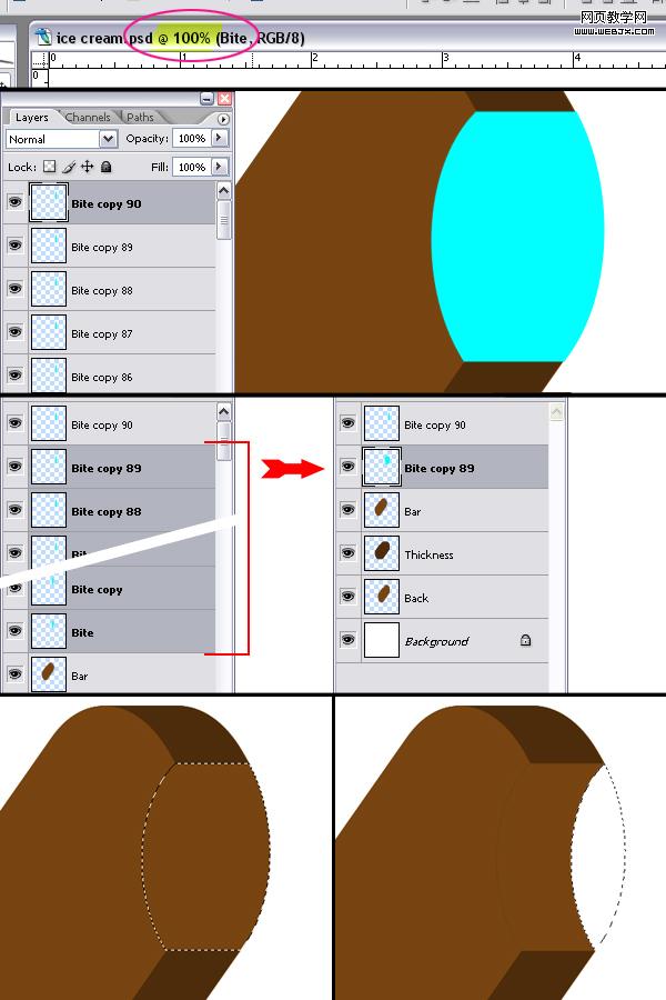 7、不取消選區,新建一個名為“bite”的圖層,隨便填充一個顏色,確定當前顯示的是實際大小,選擇移動工具,按住alt+向右鍵,復制九十個圖層,如圖(方法同前面制作身體厚度),把除bite副本90外的全部bite的圖層選起來,按ctrl+e合并,隱藏bite副本89圖層與bite副本90圖層,按ctrl不放點選bite副本90載入選區,不要取消選區分別點選bite89圖層,把選區內的部分刪掉,然后再載入bite副本89圖層的選區,分別點選bite圖層和bite副本88圖層,把選區內的部分刪掉,最后如下圖所示。