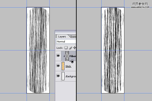 選擇移動工具,并確保你正在查看的畫布顯示100%的大小。按住alt鍵,再按下左箭頭鍵的5下復制5個副本圖層,然后從“stick副本4”選擇到“stick”圖層,然后合并它們,最后按ctrl+u進行色相/飽和度的設置,設置明度為-30。效果如下。