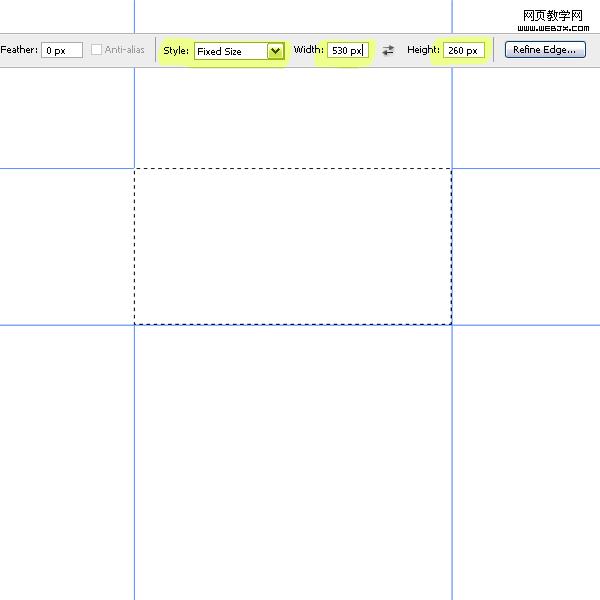 2、選擇矩形選區工具,設置固定大小為530*260,然后拖出輔助線,繪制如下一個矩形區域。