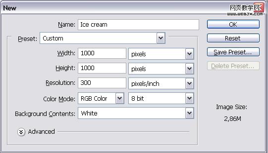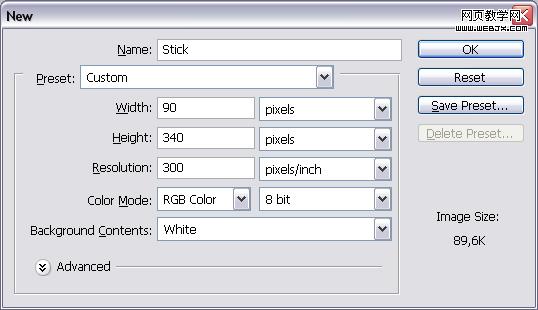 下面我們開始繪制冰激凌上的那個木棒,新建立一個90像素寬,340像素高,300像素/英寸的文檔。