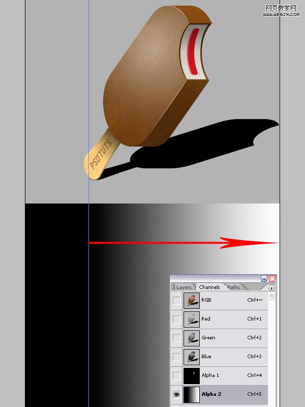 調整好shadow圖層的位置后,轉到通道面板里,新建一個alpha 2通道,用黑白漸變按紅色箭頭的起始位置按住shift拉出漸變,如下圖所示。