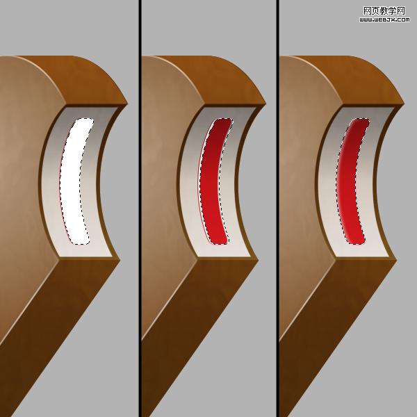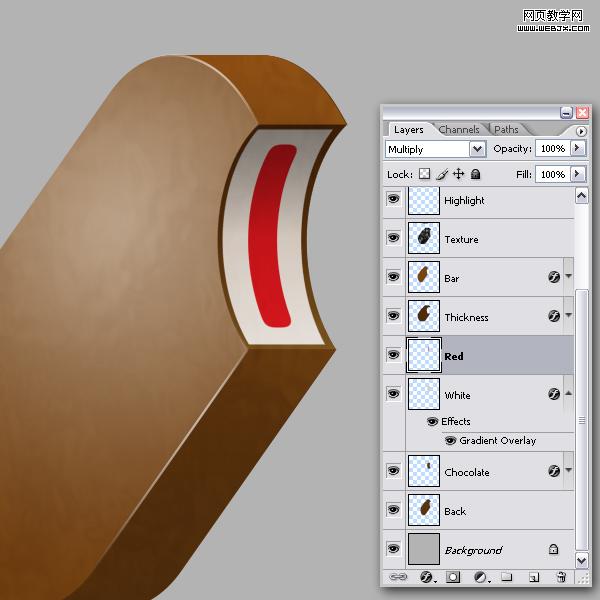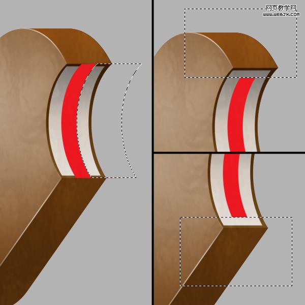 在white圖層上新建一個圖層,命名為red,點擊“巧克力”圖層載入選區。選擇red圖層,確保先中選框工具,按住shift鍵,按向右箭頭鍵三次移動30像素左右填充紅色,按shift +右箭頭三次刪除。現在,選擇矩形選框工具,并選擇red圖案的頂部的一部分,刪除,底部也用同樣的方法刪除一點。