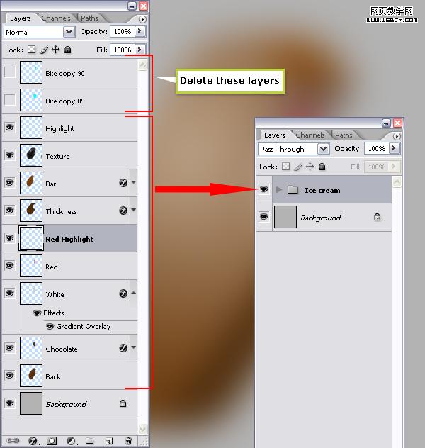 冰淇淋身體部分算完工了,為了方便可以新建一個文件夾,把所有圖層都放進去,當然那兩個bite的圖層已經沒用了,可以刪掉。