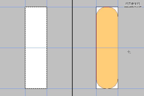 按ctrl+a全選,然后按ctrl+t進入變形模式,按ctrl+r打開標尺,如圖拉出參考線,然后按回車,取消變形,新建一個圖層命名為stick,改變前景色為#ffcc77,選擇圓角矩形工具,設置半徑為40像素,設置為形狀圖層,然后繪制如下圖一個矩形。