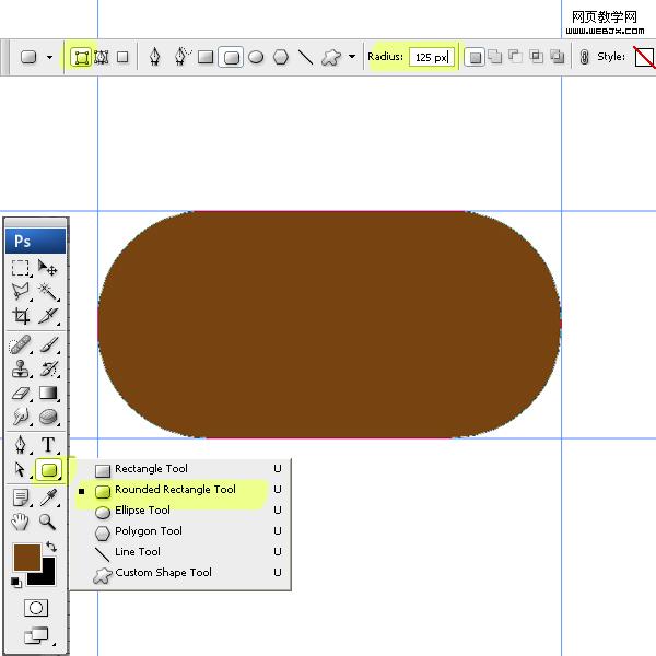 3、創建新圖層,然后使用矩形工具,設置半徑為125px圓角矩形,填充顏色為#774411,效果如下。