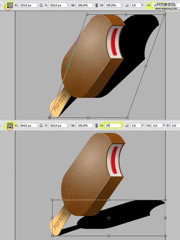 把shadow圖層移到冰激凌下面,然后按ctrl+t自由變換,設置參考點位置為左下角,并設置水平斜至-20度,然后按回車確定,再按ctrl+t,這次設置參考點位置的底部中心,并設置垂直縮放至35%,然后確定。