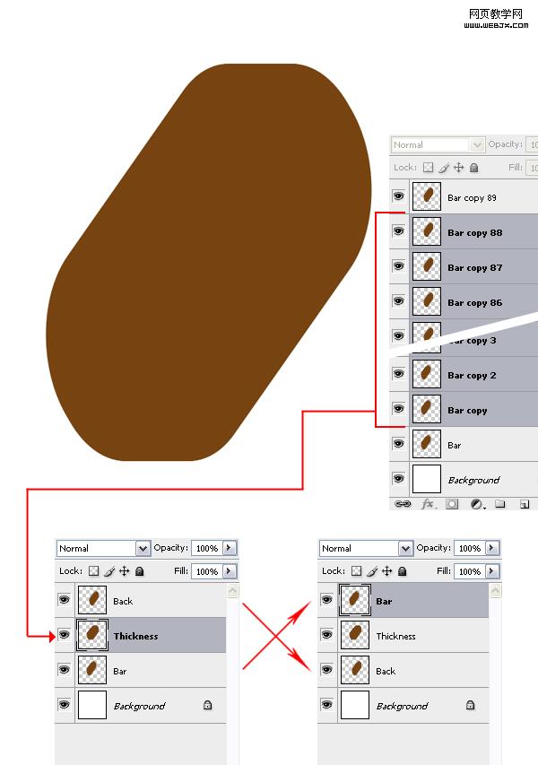 5、增加冰激凌的厚度也就是3d質感,按alt+ctrl+0使圖片100%顯示,然后使用移動工具,按住alt鍵不放向右的方向鍵按89次,這時出現效果。將除了副本89和原圖層外的所有圖層選起來按ctrl+e合并,然后把原圖層移到最上面,把副本89圖層移到合并后的副本88圖層下面,選擇副本88圖層,按ctrl+u打開色相飽和度,把明度設置為-35,效果如下圖。