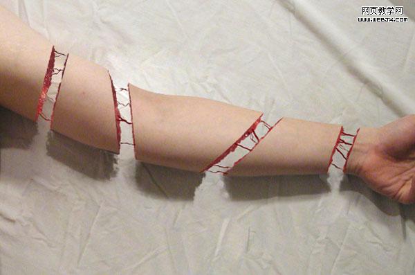 本photoshop教程主要教你制作一個(gè)非常恐怖的特效:割斷的手臂,主要是工具的實(shí)用和蒙板圖層的使用,借助一些素材達(dá)到最終的效果,本文來(lái)源國(guó)外網(wǎng)站,原作者為simon rudd,網(wǎng)頁(yè)設(shè)計(jì)翻譯此文,最終效果如下。