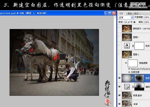 3、新建一個圖層,做透明到黑色徑向漸變。加上圖層蒙版用黑色畫筆把中間部分涂出來。
