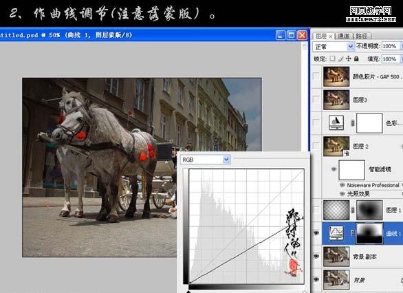 2、創建曲線調整圖層,參數設置如下圖,用黑色畫筆把馬匹及地面部分涂出來。