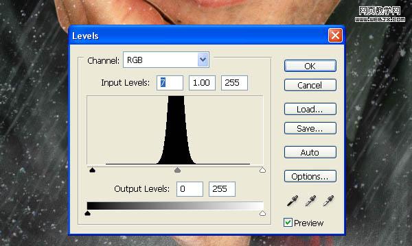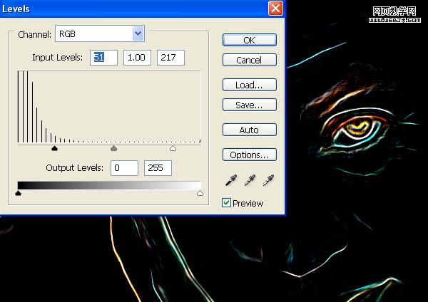 接下來如圖設置色階。設置混合模式為疊加。設置不透明度為60%。為該層添加一個蒙版來擋住人物臉上和衣服上的光線效果。