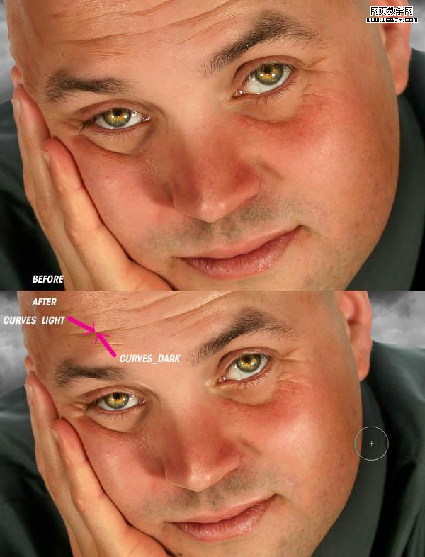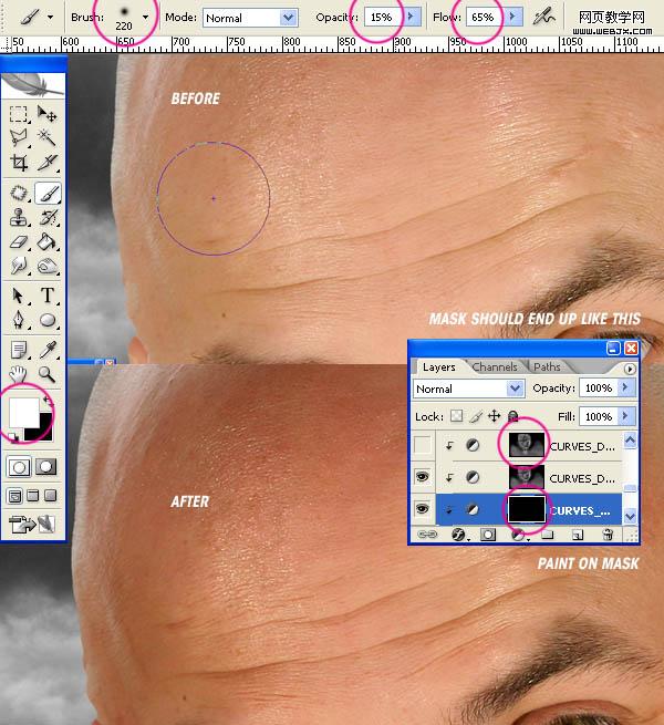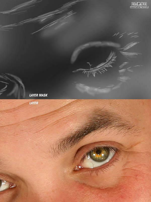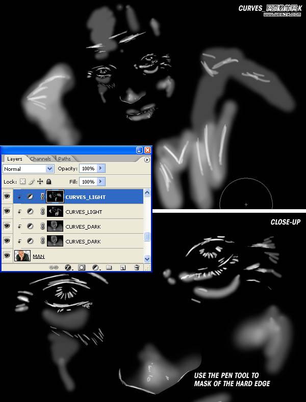在畫面上所有亮的部分畫上白顏色。為了加強皺紋等細節。你應該挨著“曲線 暗”蒙版上的白顏色畫。但是不能覆蓋掉。