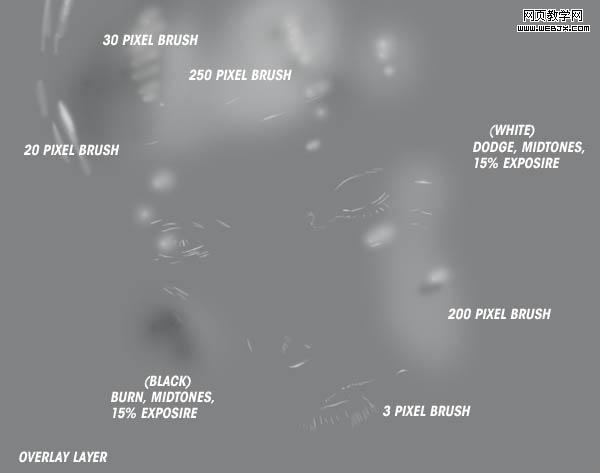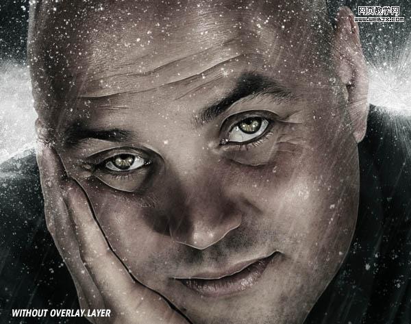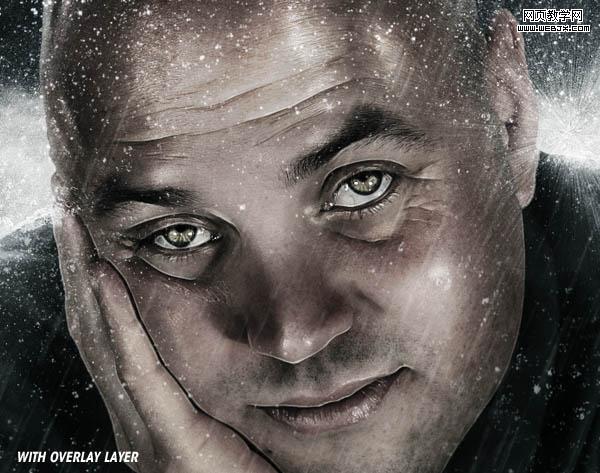 在所有圖層頂端新建一層。命名為“疊加”。填充60%的黑顏色。混合模式設置為疊加。用加深和減淡工具進一步加強畫面上的高光和暗部。