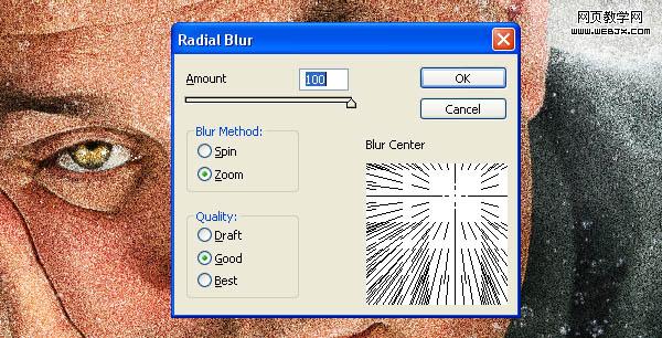 執行濾鏡>模糊>徑向模糊。模糊中心點放在人物肩膀上。