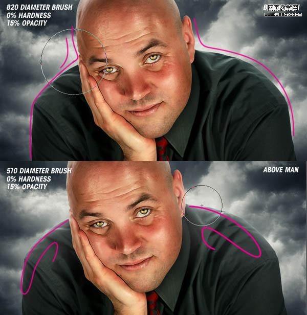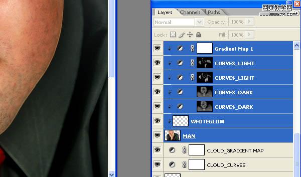 再次在人物圖層上面新建一層。使用人物圖層作為剪切路徑。然后在烏云曲線和漸變映射層下面新建另一圖層。命名這兩個新圖層為“白光”。選擇畫筆工具。按照下圖在這兩層上添加適量白色。人物后面的白光是要人物與背景拉開層次。人物前面的白光是給人物添加一些真實的背景光。