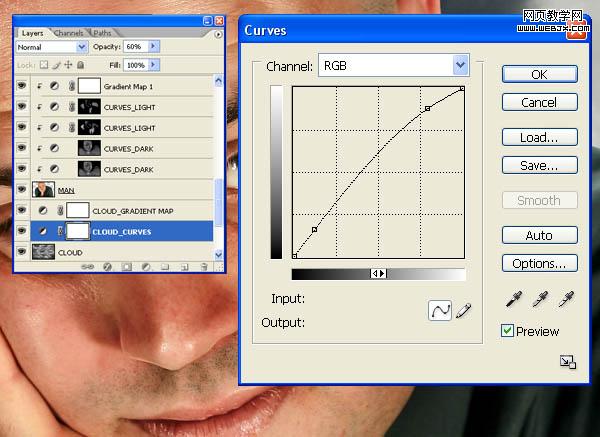現在回到背景層。確保現在我們的烏云背景只有一層而已。在其上面新建一個漸變映射調整層。設置暗部顏色為#164370 。亮部顏色為 #e2dc9a。好。設置圖層混合模式為柔光。不透明度為70%左右。在漸變映射層下面建立曲線調整層。設置如下圖。不透明度60%。你的圖層面板應該是下面這樣。