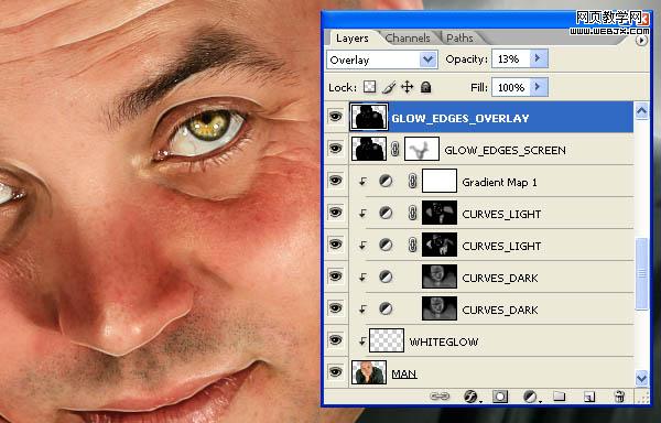 改變圖層混合模式為濾色。降低不透明度到33%。復制這一層。設置新圖層混合模式為疊加。不透明度13%。我還用蒙版屏蔽掉了原來照亮邊緣圖層的下巴部分。