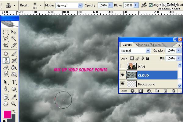 3、選擇仿制圖章工具。設置大小為400px 硬度為0 把明顯重復的烏云做適當的修改。使整個畫面更加真實自然。
