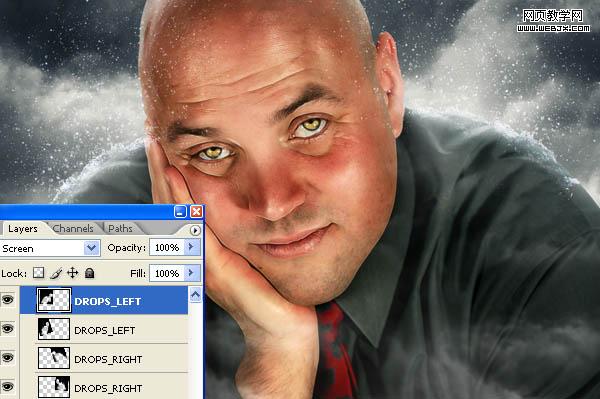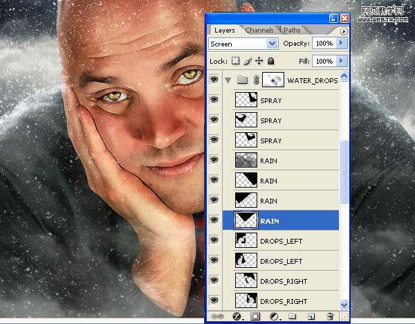 注意一下幾點。1水滴不能遮蓋到人物的細節部分。2這些水平圖層混合模式全部是濾色。3可以用上面的方法。使用蒙版加白畫筆的組合方式來微量控制水滴的強度和清晰度。