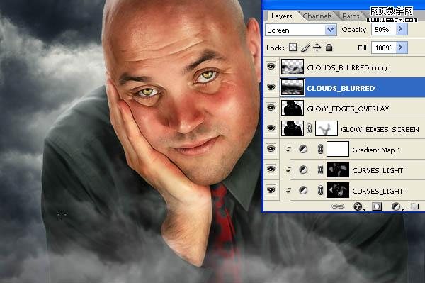 復制烏云圖層。把它拉到所有圖層最上面。應用2-3像素的高斯模糊。然后設置混合模式為濾色。不透明度50%。用軟頭的橡皮擦掉所有遮蓋到臉部和其他細節的云。再復制這一層。直到你得到一個和下面圖示一樣的霧蒙蒙的效果。將這些圖層命名為“烏云模糊”。