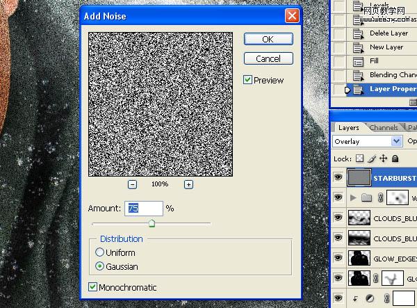 在所有圖層最頂端新建一層。命名這一層為“雨”像上面一樣填充60%的黑色和雜色。注意這一層的大小。我們要拉伸它至畫面大小。以便制造出更逼真的效果。