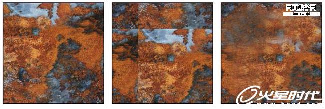 下圖中右側的是沒有修改過的原圖,緊跟的是應用了60像素水平及垂直方向位移濾鏡的圖。第三張是重新加工的位移圖像,現在出來的就是可用于平鋪的無縫材質了。