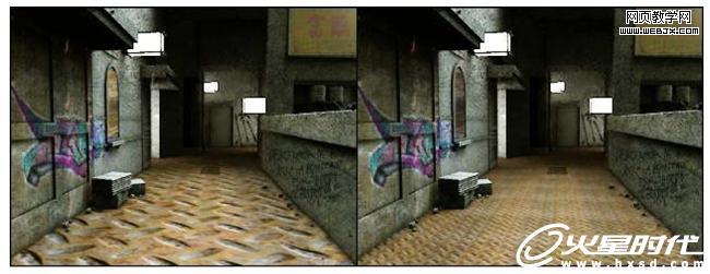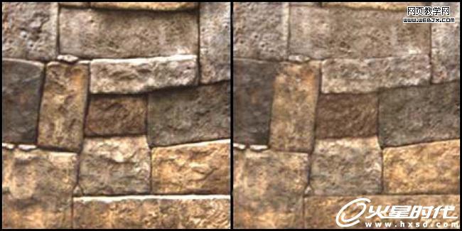如下圖所示,我們先看如何手動擦除材質中的光照效果。左邊的是琢石塊的照片。當在3d場景中打上燈光后,這樣肯定會出現穿幫,特別是場景光源方向跟素材光源方向完全相反時尤為明顯。最佳的方法是你應該使用置換貼圖作用在模型上產生形變進而得真實的陰影效果,而不是依靠材質本身。