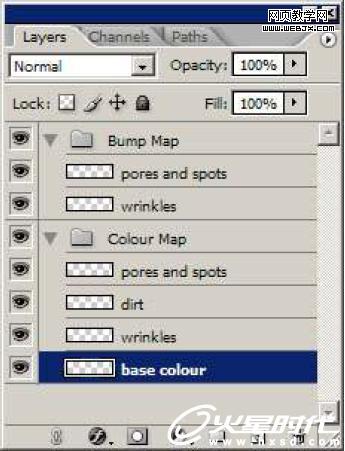 例如,你想為皮膚的色彩通道繪制一些皺紋,同理,你也需要把它們加入到你的凹凸及反射/高光貼圖中去。為皺紋創建單獨圖層意味著你可以很容易的通過拖拽來完成對其他材質通道的細節添加。
