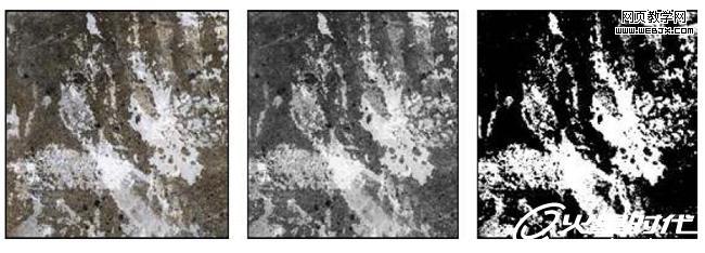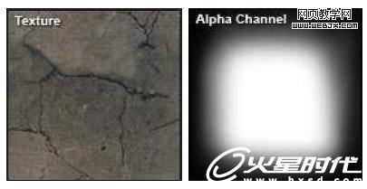 下面左側的這張圖片是一張修改過后的水泥材質,緊跟的是用筆刷簡單繪制的alpha通道。