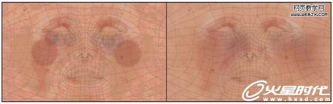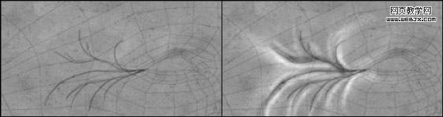 對我來說,這兩個工具另一個較為實用的用途便是在凹凸貼圖中柔化細節。下面兩張圖簡單說明皺紋凹凸貼圖的繪制方法。使用減淡工具在其他層繪制好皺紋的周圍逐步過渡減淡,可以讓左圖獲得像右圖這樣非常自然的效果。如果沒有這些過渡的話,生成的材質一旦貼到模型上你就會發現渲染效果像用鐵絲在濕粘土上畫畫的效果一樣,超級惡心。