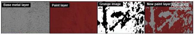 舉個例子,你有一個相對平整的金屬圖層,還有一個紅漆的圖層。你想擦掉部分紅漆圖層透出金屬圖層以便整個材質看起來有一些自然的碰損也更有年頭些。很簡單,找一張合適的圖片,如上節所描述的一樣,增加對比度直到你可以選出富含細節的選區。