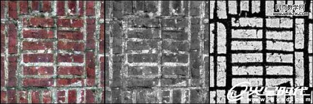 減淡加深工具對那些打算用來做材質的照片做修改處理一樣非常有用。當手頭上沒有足夠多的分層材質時,往往需要從現有素材中獲取有用的部分。下圖中的右圖是從照片中獲得的色彩貼圖。中間的那張是去色后的灰度圖。右邊的是用減淡加深工具修改好的正確的凹凸貼圖。