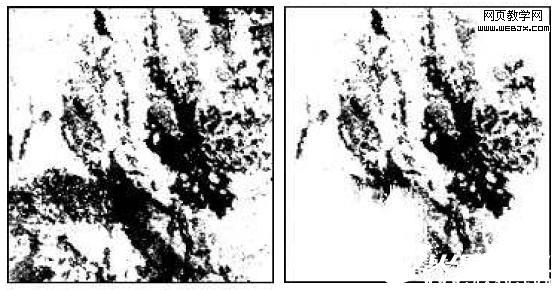 在photoshop里制作筆刷遵循這樣一個原則,圖片中的黑色部分將會成為新筆刷的不透明(實體)部分。所以我執行了反相命令(圖像>調整>反相)。如下圖左邊的那樣,飛濺部分已經變成黑色。接下來,我所要做的事情就是修邊,因為我不想要一個切邊的方形筆刷。所以我用一個白色筆刷慢慢的調整圖像的四周,直到最終筆刷的形我很滿意為止。